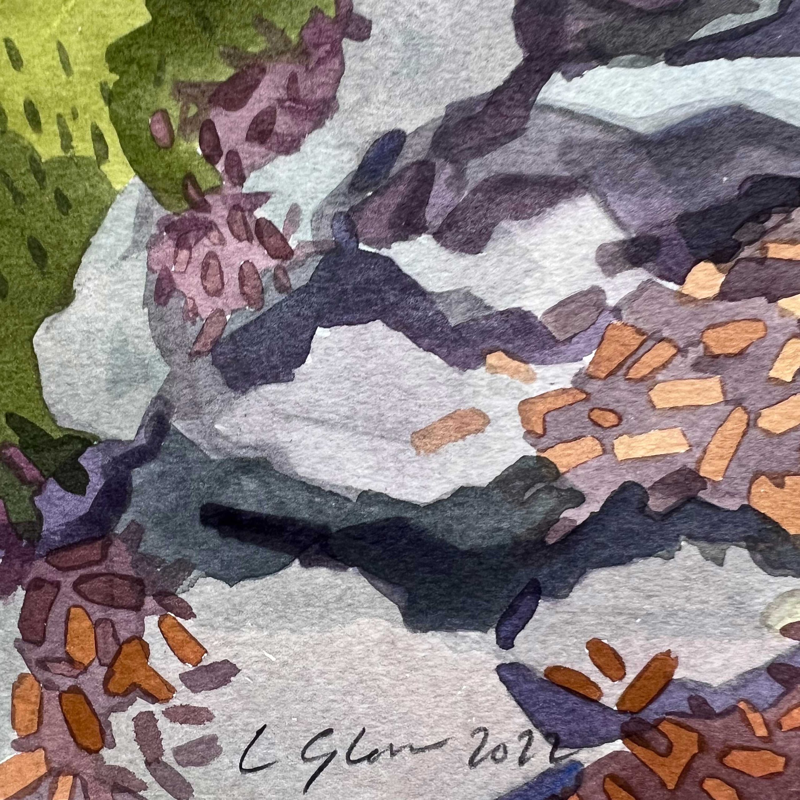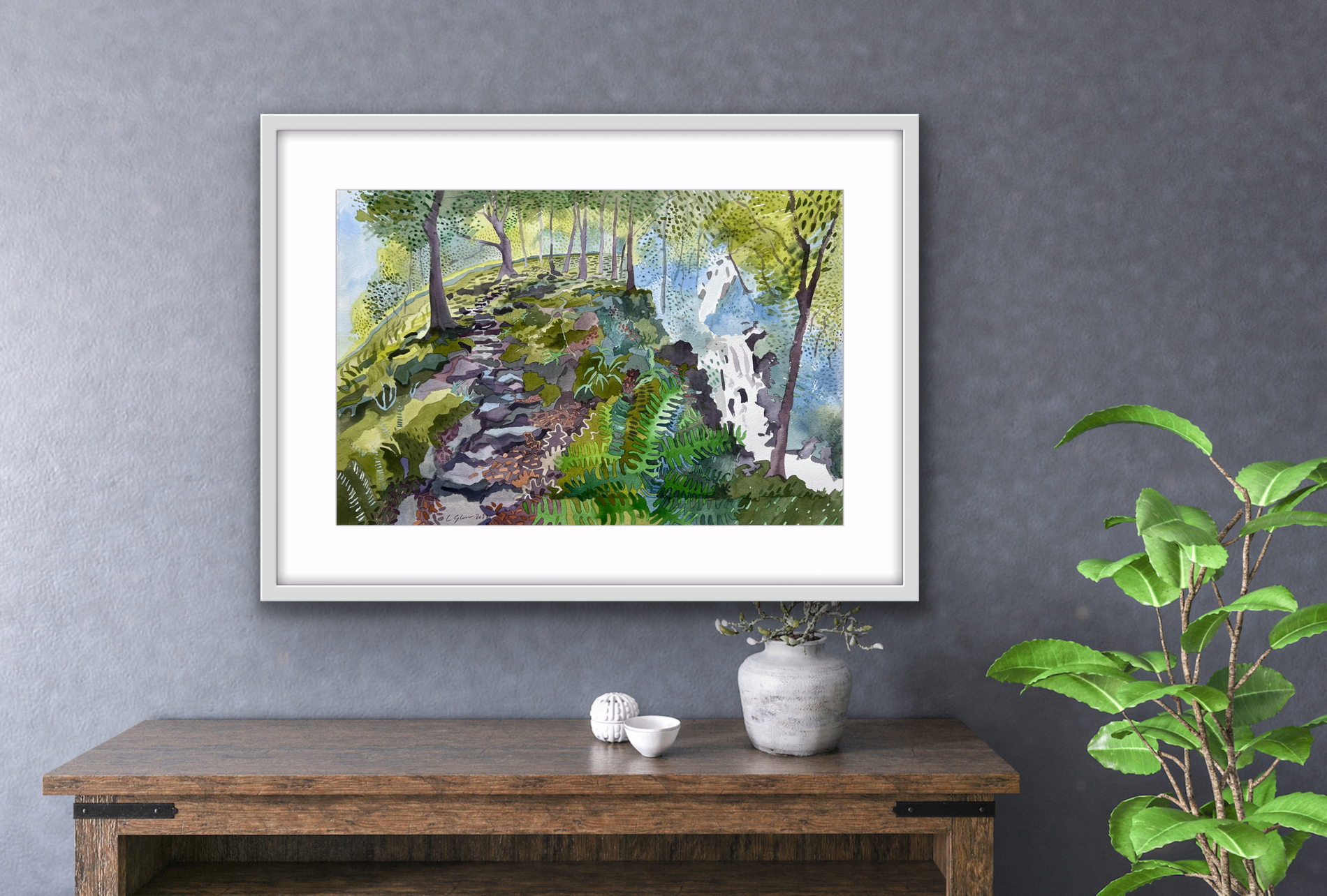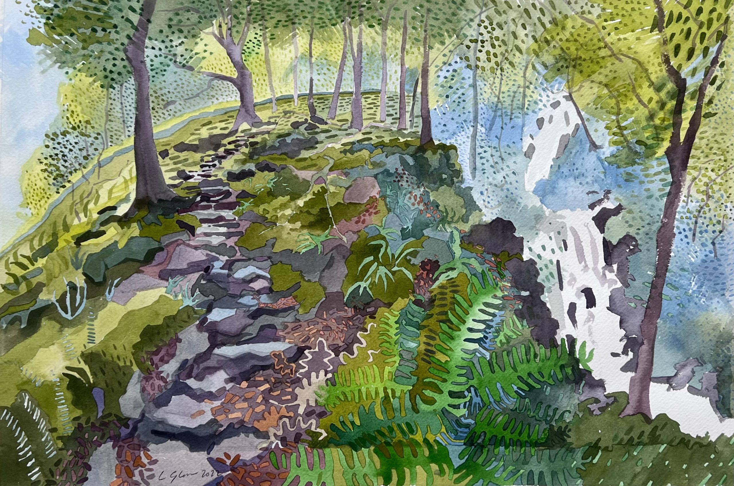 The gorge path leads walkers on to a twisting path with large steps and boulders. As you walk up and up you see glimpses of waterfalls creating a wonderful energy for the senses. The woodland feels cool, mosses and ferns on the woodland floor. Above are luminous leaves, dappled green canopies and sounds of birds and wildlife. The colours used are predominantly warm greens, cool greens, purples and blues.